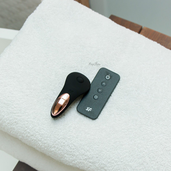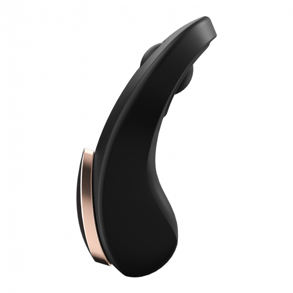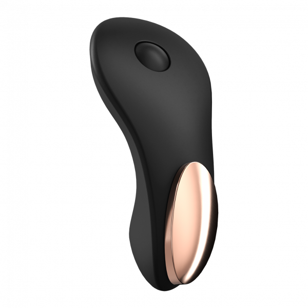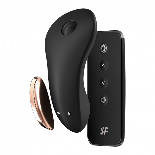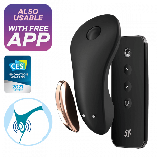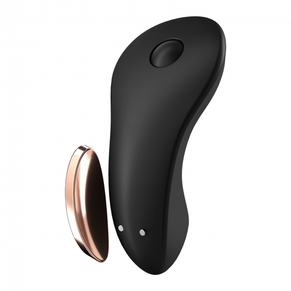 Satisfyer Little Secret App-Controlled Panty Vibrator. Sexy & discreet, the Satisfyer Little Secret slips into your underwear for clitoral stimulation. Hand a partner the remote control while you're out... Or download the free Satisfyer Connect app for custom control. . The Little Secret's magnetic clip fastens outside your underwear, connecting with the magnet underneath to keep this potent little vibrator in place. The Little Secret is ergonomically shaped to sit comfortably against the vulva. . The Little Secret syncs with the Satisfyer Connect app via Bluetooth, for unique custom vibration control. Let a partner operate your Little Secret from nearby, or connect long-distance from almost anywhere in the world. Only one partner needs a Satisfyer Connect toy! The Satisfyer app meets standardized data encryption standards, to protect your privacy. Via the app, you can change vibration and pulsation intensity, create custom patterns, sync your Little Secret to ambient noises like music around you, or sync it to your Spotify playlist.. This Satisfyer panty vibrator can be controlled any of 3 ways: (1) via the built-in power button; (2) via the included remote control, if you want phone-free sexy time; or (3) via the Satisfyer app. . Made of smooth silicone, the Satisfyer Little Secret wearable vibrator is flexible. It's waterproof and USB rechargeable too, plus it includes a stunning 15-year Satisfyer warranty. The magnetic clip and optional remote control are made of nonporous ABS plastic.. . Strong, hands-free clitoral vibrator. Perfect for foreplay and exploring public play. Long-distance enabled via free Satisfyer app. Create custom intensities and patterns in the app. OR use the included remote control for phone-free play. Magnetic clip holds vibrator in place inside underwear. Play from thousands of miles apart, or nearby. Meets data protection guidelines for your privacy & security. Smooth silicone + ABS plastic. Shaped to fit against the vulva. Raised stimulation bump for more clitoral pressure. Waterproof submersible. USB rechargeable vibrator. Remote takes 1 CR2032 battery, included. 15-year Satisfyer product guarantee. . Available in black + gold.