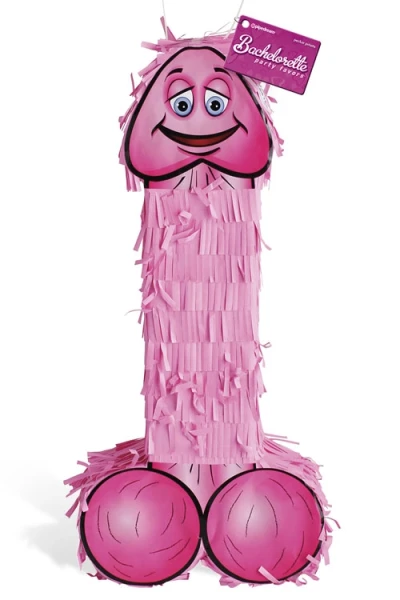 Let the lucky bride-to-be smack around a pecker one last time. This impressive 18-inch long pecker piñata makes a playful party highlight. Fill it with lots of condoms, candies, cock rings and toys (not included) that will make the girls scramble with delight.The bright pink cartoon design is set to deliver laughs all round.